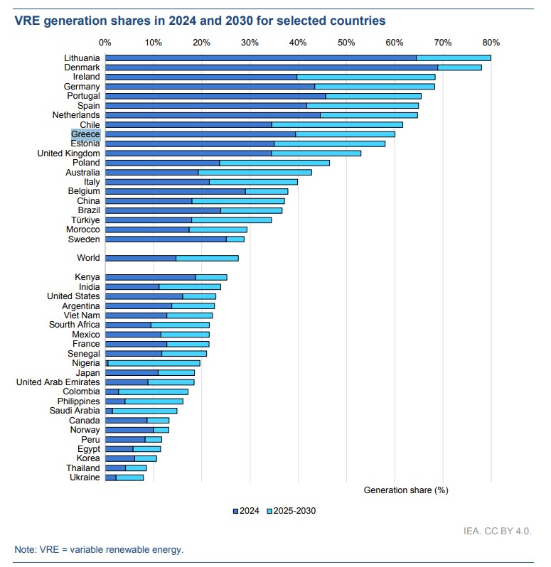 Το μερίδιο των ανανεώσιμων πηγών στην παγκόσμια ηλεκτροπαραγωγή προβλέπεται να αυξηθεί από 32% το 2024 σε 43% έως το 2030, ενώ το μερίδιο των μεταβλητών ανανεώσιμων πηγών ενέργειας (VRE), δηλαδή των αιολικών και των φωτοβολταϊκών, αναμένεται σχεδόν να διπλασιαστεί, φτάνοντας στο 28%. Αν και η υδροηλεκτρική ενέργεια υπήρξε ιστορικά η κυρίαρχη τεχνολογία ανανεώσιμης ενέργειας, η ταχεία ανάπτυξη των φωτοβολταϊκών και των αιολικών αλλάζει την ισορροπία. Το 2024, το μερίδιο παραγωγής από όλες τις πηγές VRE ξεπέρασε αυτό της υδροηλεκτρικής ενέργειας. Για την Ευρώπη, η οποία διαθέτει σήμερα το μεγαλύτερο μερίδιο παγκόσμιας παραγωγής από VRE, η διείσδυση αιολικής και ηλιακής ενέργειας στην ηλεκτροπαραγωγή αναμένεται να αυξηθεί από 25% το 2024 σε πάνω από 40% έως το 2030.