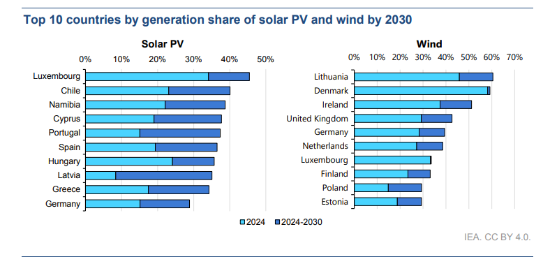 Παράλληλα, ο IEA αναφέρει πως οι βόρειες ευρωπαϊκές χώρες θα έχουν τα υψηλότερα ποσοστά αιολικής ενέργειας στο μείγμα ηλεκτροπαραγωγής τους. Η Λιθουανία θα γίνει παγκόσμιος ηγέτης, με την αιολική ενέργεια να αντιστοιχεί σε πάνω από 60% της παραγωγής ρεύματος το 2030. Ακολουθεί στενά η Δανία, όπου η υπεράκτια αιολική ενέργεια προβλέπεται να ξεπεράσει την παραγωγή από χερσαία αιολικά πάρκα. Η Ιρλανδία θα παράγει πάνω από το ήμισυ της ηλεκτρικής της ενέργειας από τον άνεμο, ενώ στο Ηνωμένο Βασίλειο η αιολική ενέργεια (κυρίως από υπεράκτια έργα) θα καλύψει ποσοστό πάνω από 40% έως το 2030, ξεπερνώντας το φυσικό αέριο.