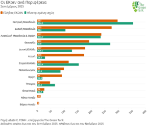 - Πρωταθλήτρια η Κεντρική Μακεδονία: Έχει τις περισσότερες ενεργειακές κοινότητες (297) και τη μεγαλύτερη ισχύ ηλεκτρισμένων (354.5 MW) αλλά και ακυρωμένων έργων (682.6 MW).