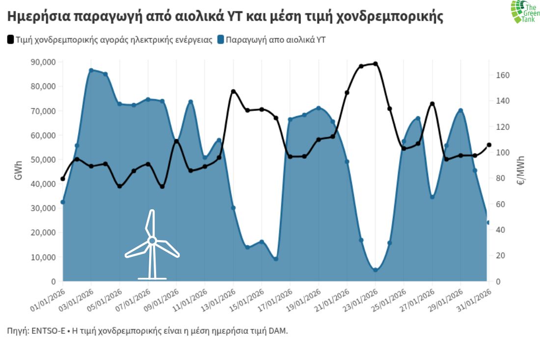 Ακόμη πιο αποκαλυπτική είναι η ημερήσια εικόνα του Ιανουαρίου. Στις αρχές του μήνα, μεταξύ 2 και 5 Ιανουαρίου, η παραγωγή από αιολικά κινήθηκε σε επίπεδα άνω των 80.000 MWh ημερησίως, με τις τιμές στη χονδρεμπορική αγορά να διατηρούνται κοντά ή και κάτω από τα 90 €/MWh. Αντίθετα, στο «βαρομετρικό χαμηλό» της 23ης και 24ης Ιανουαρίου, όταν η αιολική παραγωγή υποχώρησε ακόμη και κοντά στις 5.000–10.000 MWh ημερησίως, οι τιμές εκτινάχθηκαν προς τα 160–170 €/MWh. Η αντίστροφη αυτή πορεία επιβεβαιώνει ότι η αυξημένη παραγωγή από ΑΠΕ λειτουργεί ως άμεσος μηχανισμός αποκλιμάκωσης του κόστους.