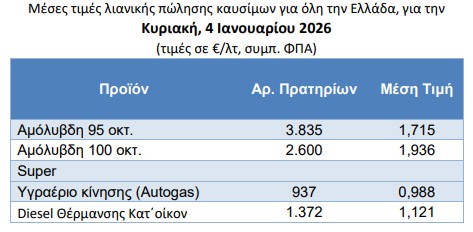 Στο 1,715 ευρώ το λίτρο βρέθηκε την Κυριακή η μέση πανελλαδική τιμή της απλής αμόλυβδης βενζίνης, ενώ η premium αμόλυβδη (100 οκτ.) ήταν στο 1,936 ευρώ το λίτρο. Το υγραέριο κίνησης βρέθηκε στο 0,988 ευρώ το λίτρο και το πετρέλαιο θέρμανσης κατ’ οίκον έφτασε το 1,121 ευρώ το λίτρο.