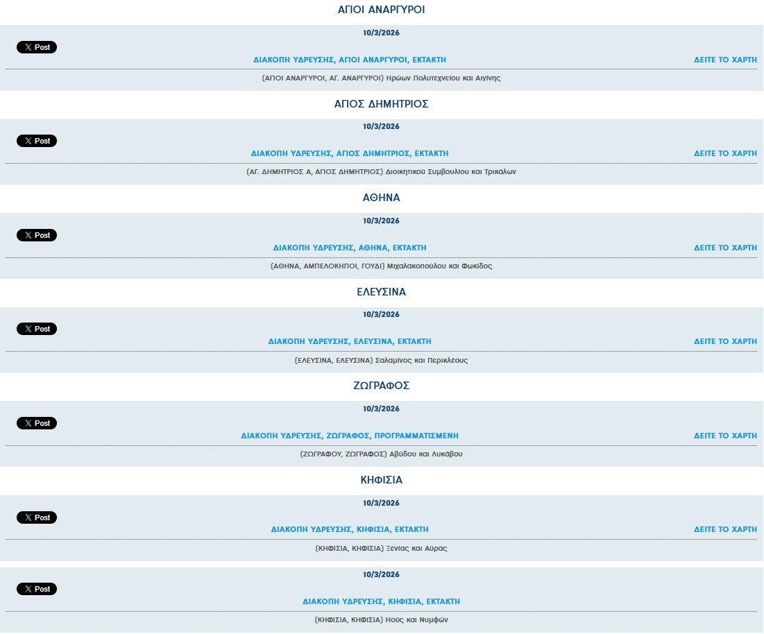 Πιο αναλυτικά, διακοπές νερού θα βιώσουν το πρωί της Τρίτης οι εξής περιοχές: