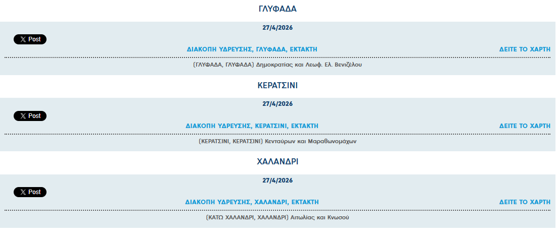 Σε έκτακτες διακοπές νερού θα προχωρήσει η ΕΥΔΑΠ το πρωί της Δευτέρας σε σημεία στη Γλυφάδα, το Κερατσίνι και το Χαλάνδρι, σύμφωνα με ενημέρωση της εταιρείας. Οι διακοπές στην υδροδότηση των εν λόγω περιοχών θα κρατήσουν πιθανότατα έως τις 3 το μεσημέρι.