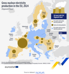 Το 2024, 12 χώρες της ΕΕ με παραγωγή πυρηνικής ηλεκτρικής ενέργειας παρήγαγαν 649 524 γιγαβάτ ώρες (GWh) ηλεκτρικής ενέργειας, σημειώνοντας αύξηση 4,8 % σε σύγκριση με το 2023. Αυτή ήταν η δεύτερη συνεχόμενη χρονιά με αύξηση μετά τη μείωση του 2022 (609 255 GWh). Οι πυρηνικοί σταθμοί ηλεκτροπαραγωγής αντιπροσώπευαν το 23,3 % της συνολικής παραγωγής ηλεκτρικής ενέργειας στην ΕΕ, σύμφωνα με τη Eurostat.