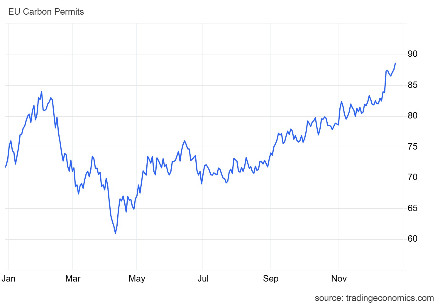 Σε αντίθεση με το TTF, οι τιμές των δικαιωμάτων εκπομπών ρύπων στην ΕΕ ανέβηκαν σημαντικά μέσα στο 2025. Πιο αναλυτικά, από τα 60 ευρώ ανά τόνο CO2 όπου βρίσκονταν τον Απρίλιο, τους τελευταίους μήνες παρακολουθούμε ένα ράλι αυξήσεων, με τις τιμές των δικαιωμάτων ρύπων να βρίσκονται πλέον στα 88 ευρώ ανά τόνο, με προοπτικές να φτάσουν ακόμα και τα 100 ευρώ μέσα στο 2026. Αυτή η εξέλιξη αποτελεί παράγοντα που ασκεί ανοδικές πιέσεις προς τις χονδρικές τιμές ρεύματος στην Ευρώπη, περιορίζοντας τα οφέλη από την πτώση των τιμών του φυσικού αερίου.