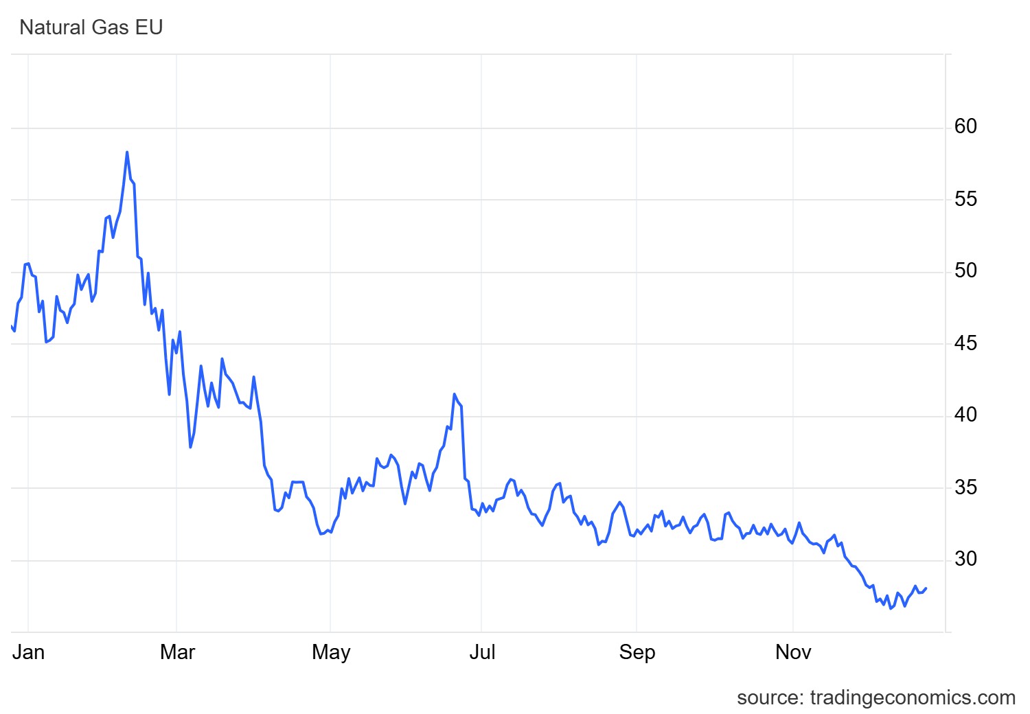 Μέσα στο 2025 υπήρξε μια μεγάλη αποκλιμάκωση στις ευρωπαϊκές τιμές φυσικού αερίου, κάτι που συνέβαλε στο «ξεφούσκωμα» των χονδρικών τιμών ρεύματος. Ειδικότερα, από τα επίπεδα των 58 ευρώ ανά μεγαβατώρα που βρισκόταν το TTF τον Φεβρουάριο, έπεσε στα 26 ευρώ ανά μεγαβατώρα τον Δεκέμβριο, ενώ αυτές τις ημέρες βρίσκεται γύρω στα 27-28 ευρώ. Η προσφορά μεγάλων ποσοτήτων LNG και αερίου μέσω αγωγών από τις ΗΠΑ και τη Νορβηγία αντίστοιχα, συνέβαλαν σε αυτή την αποκλιμάκωση τιμών. Παρόλα αυτά, συνέχισε να υπάρχει μεγάλη διακύμανση μεταξύ των χονδρικών τιμών ενέργειας των κρατών μελών, με τις χώρες της ΝΑ και Κεντρικής Ευρώπης να επιβαρύνονται δυσανάλογα.