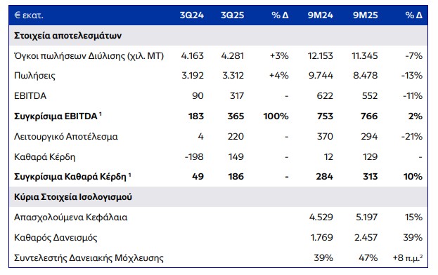 Στα 365 εκατ. ευρώ έφτασαν τα EBITDA της Helleniq Energy το τρίτο τρίμηνο του 2025, σημειώνοντας σημαντική αύξηση από τα 183 εκατ. του γ’ τριμήνου 2024. Τα καθαρά κέρδη έφτασαν τα 149 εκατ. ευρώ και τα συγκρίσιμα καθαρά κέρδη 186 εκατ. ευρώ. Στο εννεάμηνο, τα EBITDA βρέθηκαν στα 552 εκατ. ευρώ, σημειώνοντας πτώση 11% σε σχέση με πέρσι, ωστόσο τα συγκρίσιμα καθαρά κέρδη ανήλθαν σε 313 εκατ. ευρώ, σημειώνοντας αύξηση 10%.