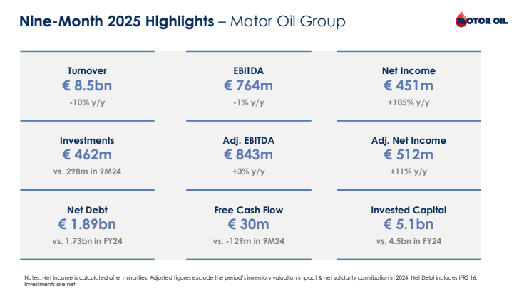 Με ενίσχυση της κερδοφορίας ολοκλήρωσε η Motor Oil το εννεάμηνο του 2025, καθώς τα καθαρά κέρδη μετά από δικαιώματα μειοψηφίας ανήλθαν σε 451 εκατ. ευρώ, σημειώνοντας άλμα 105% σε σχέση με τα 220 εκατ. ευρώ της αντίστοιχης περιόδου του 2024. Τα προσαρμοσμένα καθαρά κέρδη διαμορφώθηκαν στα 512 εκατ. ευρώ.