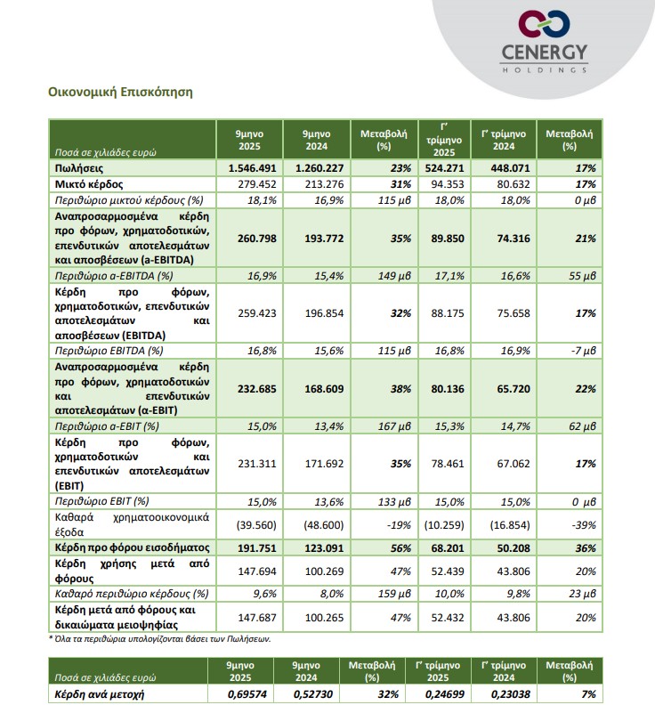 Μέσα στην ανακοίνωσή της, η Cenergy αναφέρει τα εξής: «Εντός του εννεάμηνου 2025, οι Πωλήσεις αυξήθηκαν κατά 23% ανερχόμενες σε 1.546 εκατ. ευρώ, ενώ το αναπροσαρμοσμένο EBITDA ανήλθε σε 261 εκατ. ευρώ, 67 εκατ. ευρώ (ή 35%) υψηλότερα σε σχέση με την αντίστοιχη περσινή περίοδο. Εντός του τρίτου τριμήνου 2025, τα ενεργειακά έργα εκτελέστηκαν αποτελεσματικά ενώ η αξιοποίηση όλων των γραμμών παραγωγής παρέμεινε υψηλή, οδηγώντας σε πωλήσεις ύψους 524 εκατ. ευρώ, αυξημένες κατά 17% σε σχέση με το αντίστοιχο τρίμηνο του 2024. Το ευνοϊκό μείγμα έργων που εκτελέστηκε και από τους δύο τομείς κράτησε τα περιθώρια γύρω στο 17% παράγοντας λειτουργικά κέρδη (αναπροσαρμοσμένο EBITDA) ύψους 90 εκατ. ευρώ (+21% σε σχέση με το τρίτο τρίμηνο του 2024).