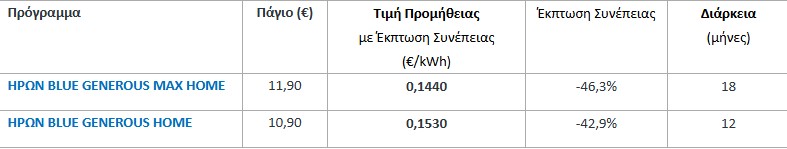 Παράλληλα, η εταιρεία προσφέρει και σταθερά μπλε τιμολόγια. Το ΗΡΩΝ BLUE GENEROUS MAX HOME προσφέρεται στα 14,40 λεπτά ανά κιλοβατώρα, με πάγιο 11,90 ευρώ και διάρκεια 18 μήνες, ενώ το ΗΡΩΝ BLUE GENEROUS HOME βρίσκεται στα 15,30 λεπτά ανά κιλοβατώρα, με πάγιο 10,90 ευρώ και διάρκεια 12 μήνες.