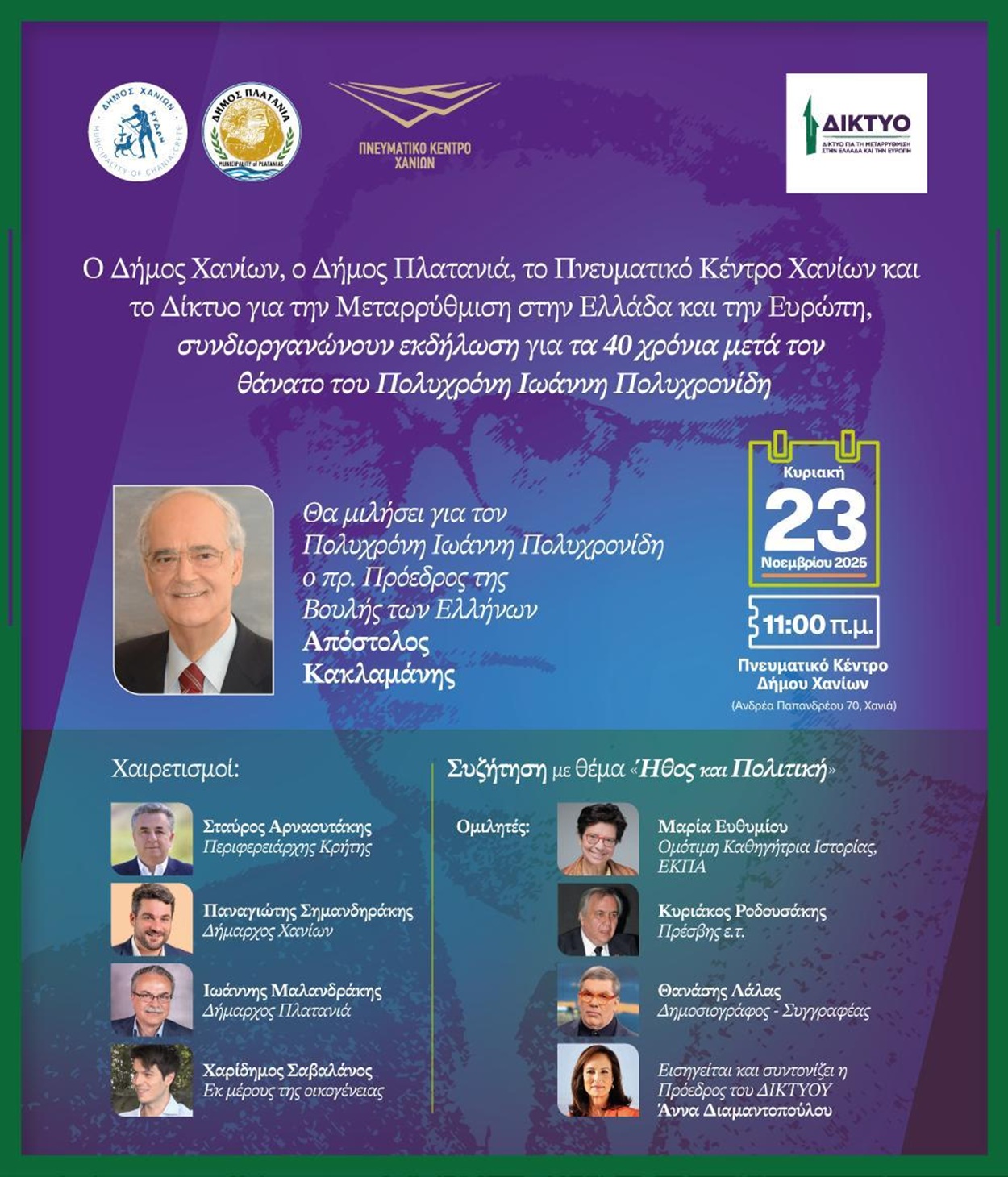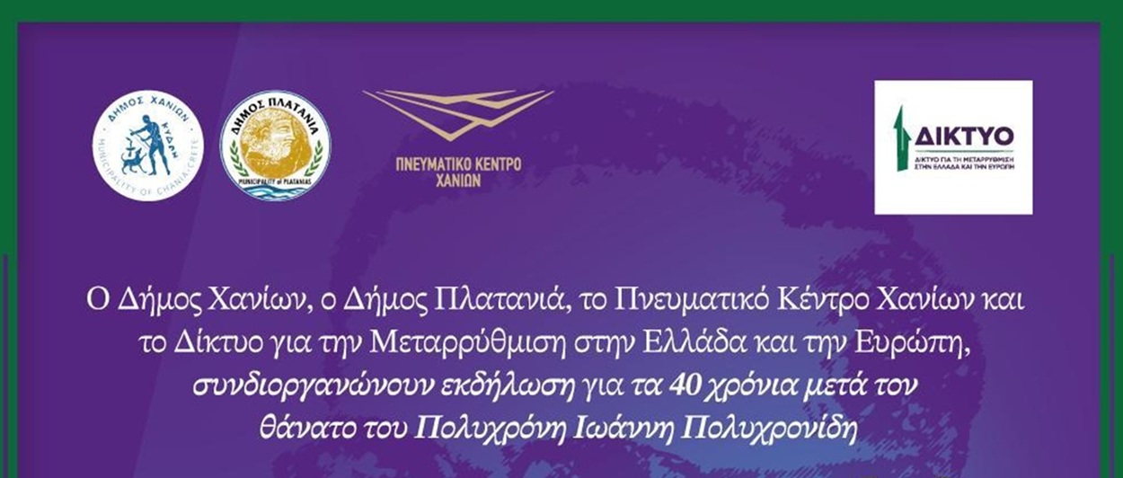 Μια επετειακή εκδήλωση θα πραγματοποιηθεί στις 23 Νοεμβρίου 2025, στις 11 π.μ., στο Πνευματικό Κέντρο Χανίων, με αφορμή τη συμπλήρωση 40 ετών από τον θάνατο του Πολυχρόνη Ιωάννη Πολυχρονίδη. Τη διοργάνωση έχουν αναλάβει από κοινού ο Δήμος Χανίων, το Πνευματικό Κέντρο Χανίων, ο Δήμος Πλατανιά και το Δίκτυο για τη Μεταρρύθμιση στην Ελλάδα και την Ευρώπη. Κεντρικός ομιλητής της εκδήλωσης θα είναι ο πρώην πρόεδρος της Βουλής των Ελλήνων, Απόστολος Κακλαμάνης.