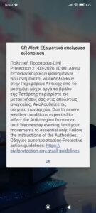 Ήχησε το 112 για τους κατοίκους στην Αττική σχετικά με την κακοκαιρία. Στο μήνυμα, που έφθασε στα κινητά τηλέφωνα στις 10:00 το πρωί της Τετάρτης 21 Ιανουαρίου, γίνεται λόγος για ακραία καιρικά φαινόμενα, καλώντας τους πολίτες να αποφύγουν τις άσκοπες μετακινήσεις. Μέσα στις επόμενες ώρες αναμένεται ραγδαία επιδείνωση του καιρού.