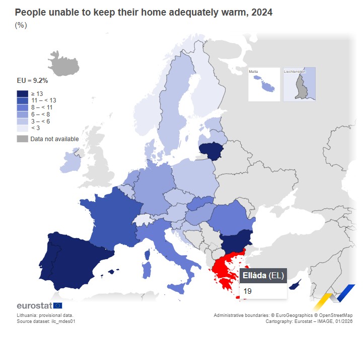 Η ενεργειακή φτώχεια αποτελεί ένα από τα πιο σημαντικά ζητήματα που προσπαθεί να αντιμετωπίσει η Ευρώπη. Σύμφωνα με στοιχεία της Eurostat, το 2024 το 9,2% του πληθυσμού της ΕΕ δεν ήταν σε θέση να διατηρεί το σπίτι του επαρκώς ζεστό. Σε σύγκριση με το 2023, αυτό αντιπροσωπεύει βελτίωση κατά 1,4 ποσοστιαίες μονάδες. Τα υψηλότερα ποσοστά ατόμων που δεν μπορούσαν να διατηρούν τα σπίτια τους επαρκώς ζεστά καταγράφηκαν στην Ελλάδα και τη Βουλγαρία, όπου και στις δύο χώρες το ποσοστό ήταν 19,0%, ακολουθούμενες από τη Λιθουανία (18,0%) και την Ισπανία (17,5%).