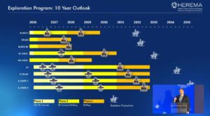 Σύμφωνα με τον σχεδιασμό που παρουσίασε, η πρώτη φάση ερευνών θα διαρκέσει περίπου τρία χρόνια και θα περιλαμβάνει κυρίως δισδιάστατες σεισμικές καταγραφές, ενώ στη δεύτερη φάση προβλέπονται τρισδιάστατες σεισμικές έρευνες και, σε επόμενο στάδιο, τουλάχιστον μία ερευνητική γεώτρηση ανά περιοχή. Οι συνολικές τραπεζικές εγγυήσεις για τις τέσσερις περιοχές εκτιμάται ότι μπορούν να φτάσουν τα 100 εκατ. ευρώ εφόσον το πρόγραμμα εξελιχθεί σε πλήρη ανάπτυξη.