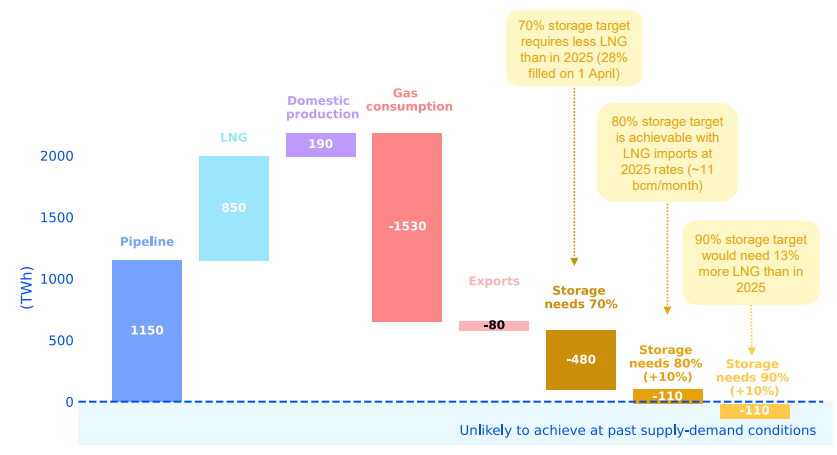 Η πλήρωση των ευρωπαϊκών αποθηκών φυσικού αερίου στο 90% μέχρι τον επόμενο χειμώνα θα είναι εφικτή μόνο αν οι ροές μέσω αγωγών παραμείνουν σε υψηλά επίπεδα και οι εισαγωγές LNG αυξηθούν κατά περίπου 13% σε σχέση με το 2025, αναφέρει ο ACER σε νέα έκθεσή του. Μάλιστα, σημειώνει πως αν οι τιμές ανέλθουν στα 50 ευρώ ανά μεγαβατώρα, τότε το επιπλέον κόστος για εισαγωγές LNG μπορεί να φτάσει τα 10 με 15 δισεκατομμύρια ευρώ. Οι προθεσμιακές τιμές στις αρχές Απριλίου δείχνουν ότι οι εισαγωγές LNG θα έχουν υψηλότερο κόστος σε σχέση με προηγούμενα χρόνια, λόγω πιο «σφιχτής» παγκόσμιας αγοράς, προσθέτει. Το βράδυ της Πέμπτης, το TTF, ο δείκτης για τις ευρωπαϊκές τιμές φυσικού αερίου, βρισκόταν στα 45,80 ευρώ ανά μεγαβατώρα, αυξημένος κατά περίπου 5% σε σχέση με την Τετάρτη. Μέσα στον Μάρτιο, το TTF είχε φτάσει ακόμη και τα 74 ευρώ ανά μεγαβατώρα, στο πλαίσιο του πολέμου μεταξύ Ιράν και ΗΠΑ – Ισραήλ.