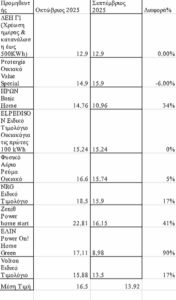 Συμπερασματικά, όπως φαίνεται και στον σχετικό πίνακα, τα πράσινα τιμολόγια διαμορφώθηκαν κατά μέσο όρο στα 16,5 λεπτά ανά κιλοβατώρα για τον τρέχοντα μήνα όταν ο μέσος όρος έναν μήνα πριν ήταν στα 13,92 λεπτά/κιλοβατώρα, μια εικόνα που δεν λαμβάνει ωστόσο υπόψη τα μερίδια αγοράς του κάθε παρόχου. Υπενθυμίζεται ότι τον Σεπτέμβριο οι πάροχοι ρεύματος είχαν προσφέρει τα χαμηλότερα πράσινα τιμολόγια από την αρχή του έτους, με τον μέσο όρο των χρεώσεων στην εν λόγω κατηγορία- στην οποία βρίσκεται ακόμη το 67% του συνόλου των καταναλωτών- να διαμορφώνεται λίγο κάτω από τα 14 λεπτά/κιλοβατώρα, από 18,3 λεπτά/κιλοβατώρα τον Αύγουστο.