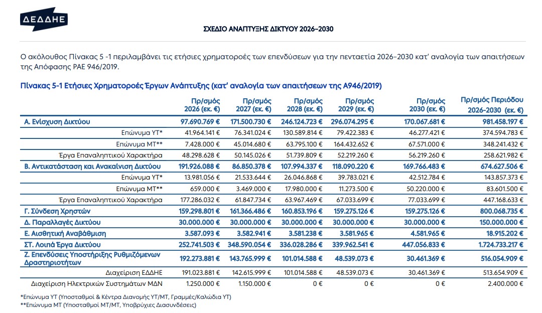Οι επενδύσεις του ΔΕΔΔΗΕ για την πενταετία από το 2026 έως το 2030 πρόκειται να φτάσουν κοντά στα 4,87 δισεκατομμύρια ευρώ, σύμφωνα με το επικαιροποιημένο Σχέδιο Ανάπτυξης Δικτύου που έθεσε σε διαβούλευση τη Δευτέρα η Ρυθμιστική Αρχή Αποβλήτων, Ενέργειας και Υδάτων (ΡΑΑΕΥ). Τα χρήματα θα κατευθυνθούν σε ένα πλήθος έργων απαραίτητων για την ανάπτυξη του δικτύου διανομής ηλεκτρικής ενέργειας, τα οποία διακρίνονται από τον ΔΕΔΔΗΕ σε επτά κατηγορίες. Η πρώτη κατηγορία, η οποία καταλαμβάνει μεγάλο μέρος του προϋπολογισμού είναι η «Ενίσχυση Δικτύου», με τις συνολικές επενδύσεις να ξεπερνούν τα 981 εκατ. ευρώ στη διάρκεια της περιόδου 2026-2030. Στην κατηγορία «Αντικατάσταση και Ανακαίνιση Δικτύου» υπάρχουν έργα τα οποία θα κοστίσουν γύρω στα 674 εκατ. ευρώ στη διάρκεια της πενταετίας, ενώ η «Σύνδεση Χρηστών» θα κοστίσει λίγο πάνω από 800 εκατ. ευρώ την ίδια περίοδο. Τα έργα που αφορούν στις «Παραλλαγές Δικτύου» θα κοστίσουν συνολικά 150 εκατ. ευρώ, ενώ η «Αισθητική Αναβάθμιση» του δικτύου θα κοστίσει κοντά στα 19 εκατ. ευρώ. Τέλος, ο προϋπολογισμός προβλέπει επενδύσεις ύψους 1,724 δισ. ευρώ για «Λοιπά Έργα Δικτύου», ενώ προβλέπει επενδύσεις 516 εκατ. ευρώ για «Επενδύσεις Υποστήριξης Ρυθμιζόμενων Δραστηριοτήτων».