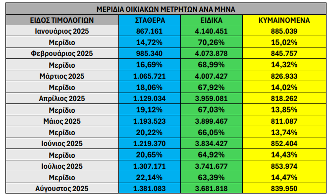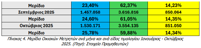 Αξίζει να σημειωθεί πως τον Ιανουάριο του 2025 βρίσκονταν στα μπλε τιμολόγια μόλις 867.161 οικιακοί μετρητές, το οποίο σημαίνει πως ο αριθμός τους σχεδόν διπλασιάστηκε μέχρι τον Οκτώβριο. Στον αντίποδα, τον Ιανουάριο βρίσκονταν στα πράσινα τιμολόγια 4.140.451 μετρητές, ενώ στη συνέχεια του έτους τα εγκατέλειψαν γύρω στους 600.000.