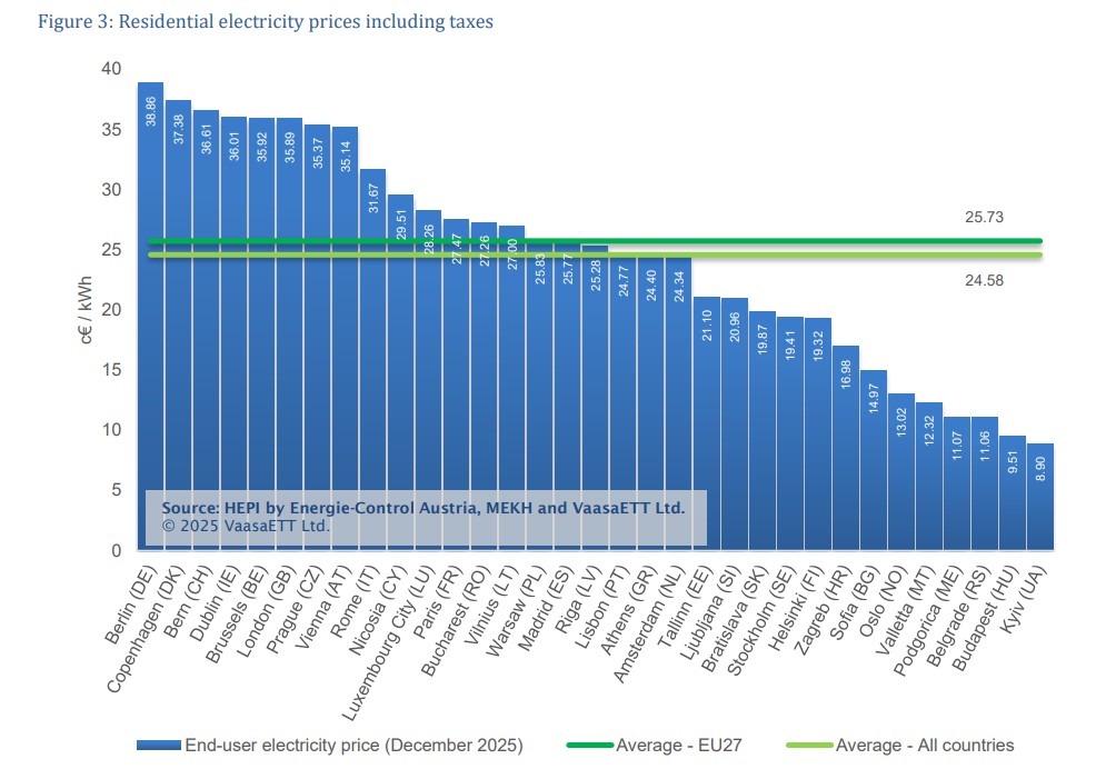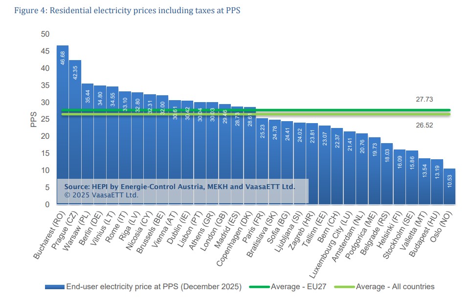 Στην 19η θέση, και κάτω από τον μέσο όρο της Ευρωπαϊκής Ένωσης, βρέθηκε η Ελλάδα τον Δεκέμβριο ως προς το ύψος των τιμών ρεύματος που πλήρωσαν τα νοικοκυριά. Συγκεκριμένα, σύμφωνα με τα τελευταία στοιχεία του δείκτη HEPI, τον Δεκέμβριο τα νοικοκυριά της Ελλάδας πλήρωσαν κατά μέσο όρο 24,40 λεπτά ανά κιλοβατώρα για το ρεύμα που κατανάλωσαν, περιλαμβανομένου του κόστους ενέργειας και των υπόλοιπων επιβαρύνσεων του λογαριασμού, ενώ ο μέσος όρος τιμών στην ΕΕ βρέθηκε στα 25,73 λεπτά ανά κιλοβατώρα. Στα 24,58 λεπτά ανά κιλοβατώρα ήταν ο μέσος όρος όλων των ευρωπαϊκών κρατών που εξετάστηκαν. Τα κράτη αυτά είναι τα μέλη της ΕΕ, καθώς και η Νορβηγία, η Ελβετία, η Σερβία, η Ουκρανία, το Μαυροβούνιο και η Μεγάλη Βρετανία.