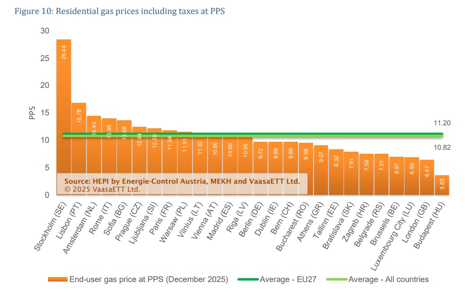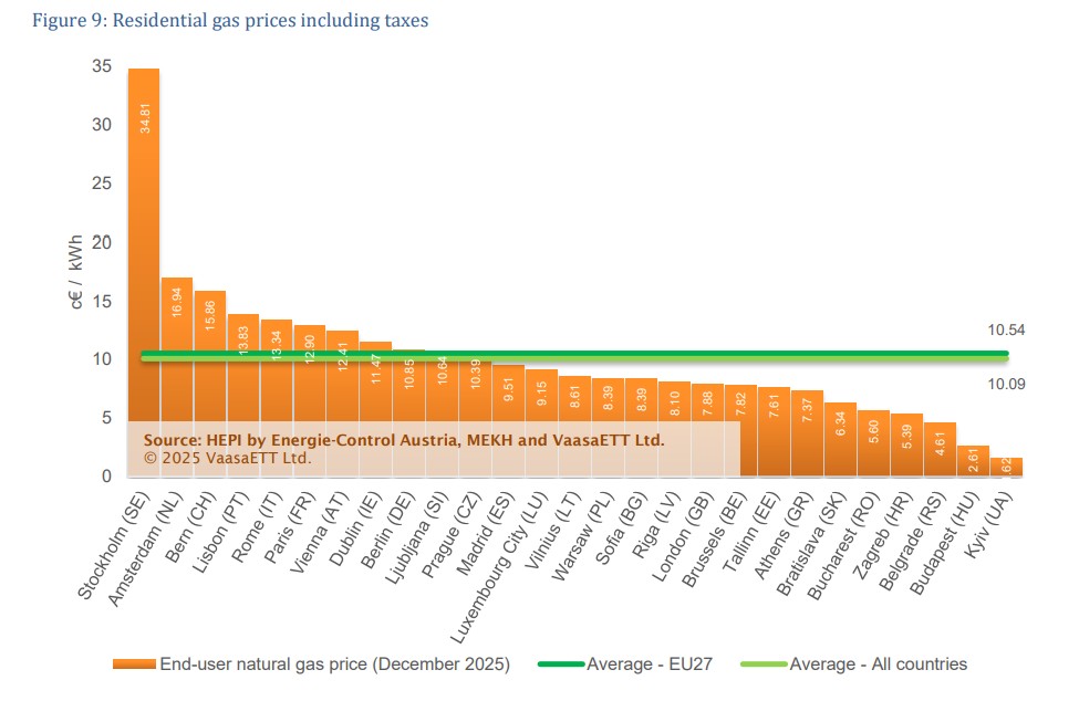 Τα στοιχεία που δημοσίευσε το HEPI για τον Δεκέμβριο δείχνουν πως η Ελλάδα βρίσκεται χαμηλά μεταξύ των ευρωπαϊκών κρατών όσον αφορά τις τιμές φυσικού αερίου που πληρώνουν τα νοικοκυριά της. Ειδικότερα, βρίσκεται στην 21η θέση, από τα 27 κράτη που εξετάστηκαν, με τιμή 7,37 λεπτά ανά κιλοβατώρα, κάτω από τον μέσο όρο της ΕΕ που βρίσκεται στα 10,54 λεπτά ανά κιλοβατώρα. Αν συνυπολογιστεί και η αγοραστική δύναμη των κατοίκων, οι τιμές που πληρώνουν τα ελληνικά νοικοκυριά φτάνουν στα 9,07 λεπτά ανά κιλοβατώρα και η χώρα μας ανεβαίνει στην 18η θέση. Μακράν τις πιο ακριβές τιμές φυσικού αερίου στην Ευρώπη πληρώνουν τα νοικοκυριά της Σουηδίας.