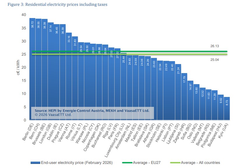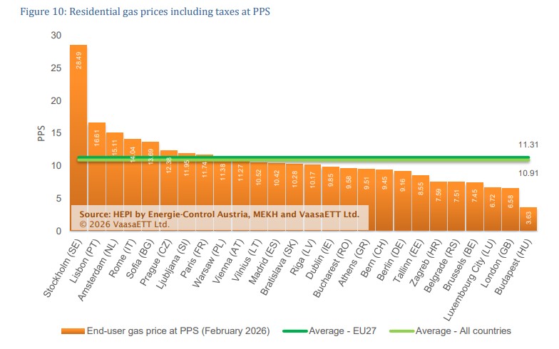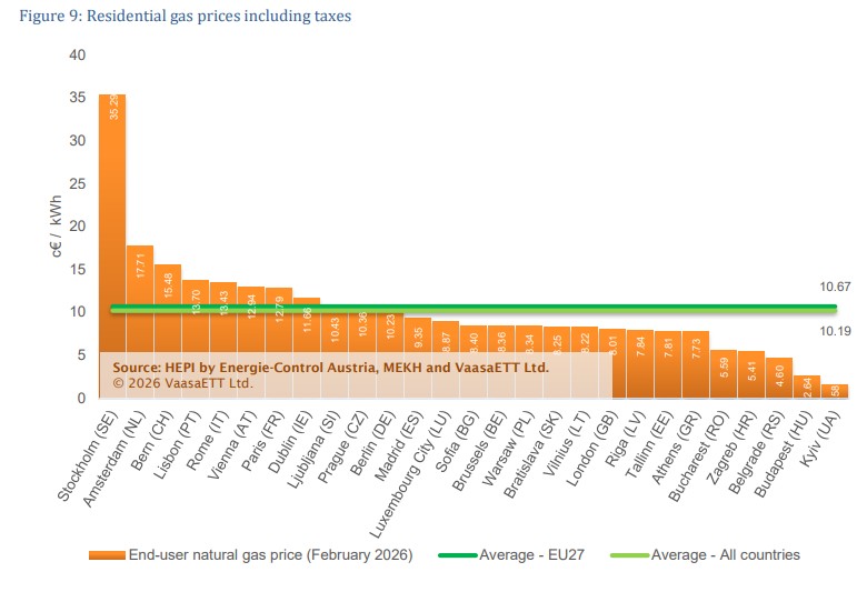 Η Ελλάδα εμφάνισε τη μεγαλύτερη μηνιαία αύξηση στην Ευρώπη ως προς την τιμή φυσικού αερίου που πλήρωσαν τα νοικοκυριά τον Φεβρουάριο. Πιο συγκεκριμένα, με ονομαστικές τιμές τα ελληνικά νοικοκυριά πλήρωσαν 7,73 λεπτά την κιλοβατώρα για το φυσικό αέριο, ενώ αν συνυπολογιστεί η αγοραστική δύναμη η τιμή έφτασε τα 9,51 λεπτά ανά κιλοβατώρα. Ωστόσο, παρά τις αυξήσεις, η χώρα μας παραμένει κάτω από τον μέσο όρο της ΕΕ και της Ευρώπης συνολικά. Το HEPI αναφέρει πως η αύξηση τιμών που είδε η ελληνική αγορά οφείλεται στην άνοδο των τιμών του TTF τον Ιανουάριο, καθώς τα περισσότερα τιμολόγια φυσικού αερίου στην Ελλάδα είναι συνδεδεμένα με την τιμή αναφοράς TTF του προηγούμενου μήνα.