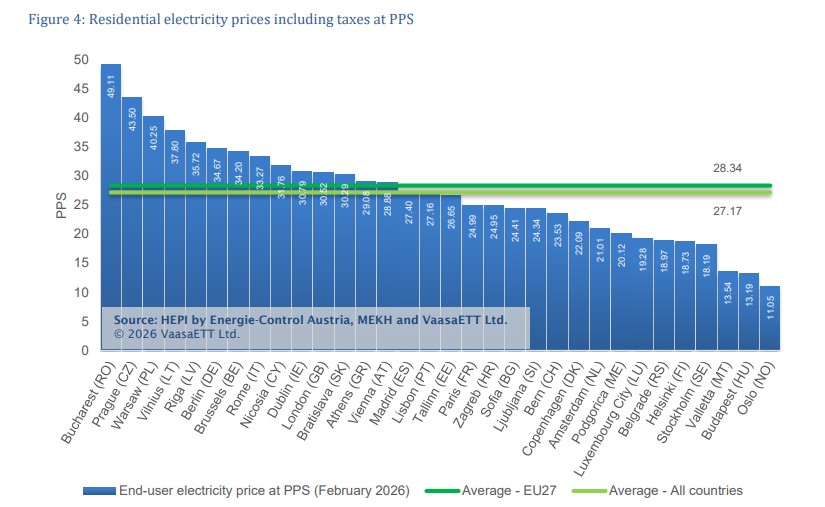 Παράλληλα, στα 23,63 λεπτά ανά κιλοβατώρα έφτασε η τελική τιμή ηλεκτρικής ενέργειας που πλήρωσαν τα νοικοκυριά στην Ελλάδα τον περασμένο μήνα, υπολογίζοντας το κόστος προμήθειας του ρεύματος μαζί με τις ρυθμιστικές χρεώσεις και τους φόρους. Αυτή η τιμή είναι κάτω από τον μέσο όρο της ΕΕ, που βρέθηκε στα 26,13 λεπτά, και της Ευρώπης συνολικά, που έφτασε στα 25,04 λεπτά, ωστόσο αν συνυπολογιστεί ο παράγοντας της αγοραστικής δύναμης των κατοίκων κάθε χώρας (PPS), τότε προκύπτει μια διαφορετική εικόνα. Πιο αναλυτικά, αν συνυπολογιστεί ο συγκεκριμένος παράγοντας το πραγματικό νούμερο που πλήρωσαν τα ελληνικά νοικοκυριά φτάνει τα 29,08 λεπτά ανά κιλοβατώρα, που ξεπερνάει ελαφρώς τον μέσο όρο της ΕΕ, ο οποίος είναι στα 28,34 λεπτά.