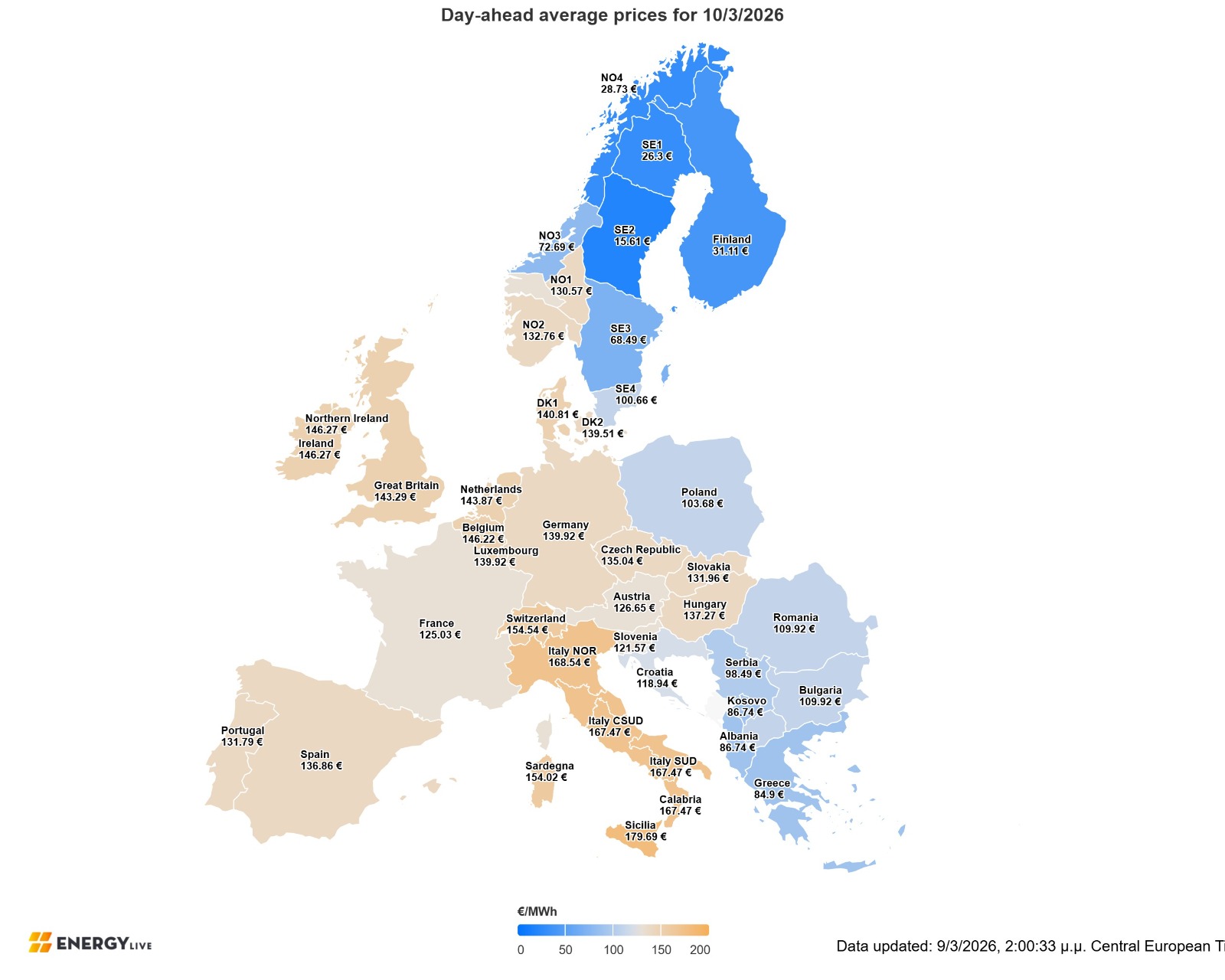 Σε τροχιά συγκράτησης -σε σύγκριση με την υπόλοιπη Ευρώπη- παραμένουν οι χονδρικές τιμές ρεύματος στην Ελλάδα, που στην παρούσα φάση «αντιστέκονται» στην ανοδική τάση των τιμών πετρελαίου και φυσικού αερίου, χάρη στον συνδυασμό υψηλής παραγωγής ΑΠΕ και υδροηλεκτρικών και χαμηλής ζήτησης. Είναι αξιοσημείωτο, όπως παρατηρούν παράγοντες της αγοράς, ότι για τη σημερινή ημέρα (Τρίτη 10 Μαρτίου) η χώρα μας είναι εξαγωγική προς όλες τις διασυνδέσεις της, ενώ η πράσινη «υπερπαραγωγή» -ειδικά τις μεσημεριανές ώρες λόγω της ισχυρής παρουσίας των φωτοβολταϊκών- οδήγησε στη διαμόρφωση μηδενικών τιμών για επτά ολόκληρες ώρες, από τις 9 το πρωί έως τις 4 το μεσημέρι. Έτσι, για τη σημερινή ημέρα η μέση τιμή στην Προημερήσια Αγορά του Ελληνικού Χρηματιστηρίου Ενέργειας διαμορφώνεται στα 84,90 ευρώ/MWh, -τέταρτη χαμηλότερη πανευρωπαϊκά μετά από Φινλανδία, Σουηδία και Εσθονία-, παραμένοντας για πέμπτη συνεχόμενη ημέρα κάτω από το φράγμα των 90 ευρώ/MWh. Η συμμετοχή των ΑΠΕ στο μείγμα της ηλεκτροπαραγωγής ανήλθε στο 52,01%, του φυσικού αερίου στο 26% , των υδροηλεκτρικών στο 15,06% και του λιγνίτη στο 4,06%. Είναι αξιοσημείωτο ότι η μέση τιμή σημείωσε οριακή αύξηση σε σχέση με την αμέσως προηγούμενη ημέρα, παρά τη μείωση της εκτιμώμενης αιολικής παραγωγής σχεδόν κατά 40% . Την ίδια στιγμή, σε χαμηλότερα επίπεδα σε σχέση με τις υπόλοιπες αγορές της Κεντρικής και Δυτικής Ευρώπης διαμορφώθηκε η μέση τιμή και στις αγορές της Ρουμανίας και της Βουλγαρίας, με τον πάλαι ποτέ «διακεκαυμένο άξονα» να εμφανίζεται αυτές τις ημέρες -για συγκυριακούς λόγους έστω- σε καλύτερη θέση από τις περισσότερες αγορές της Γηραιάς Ηπείρου.