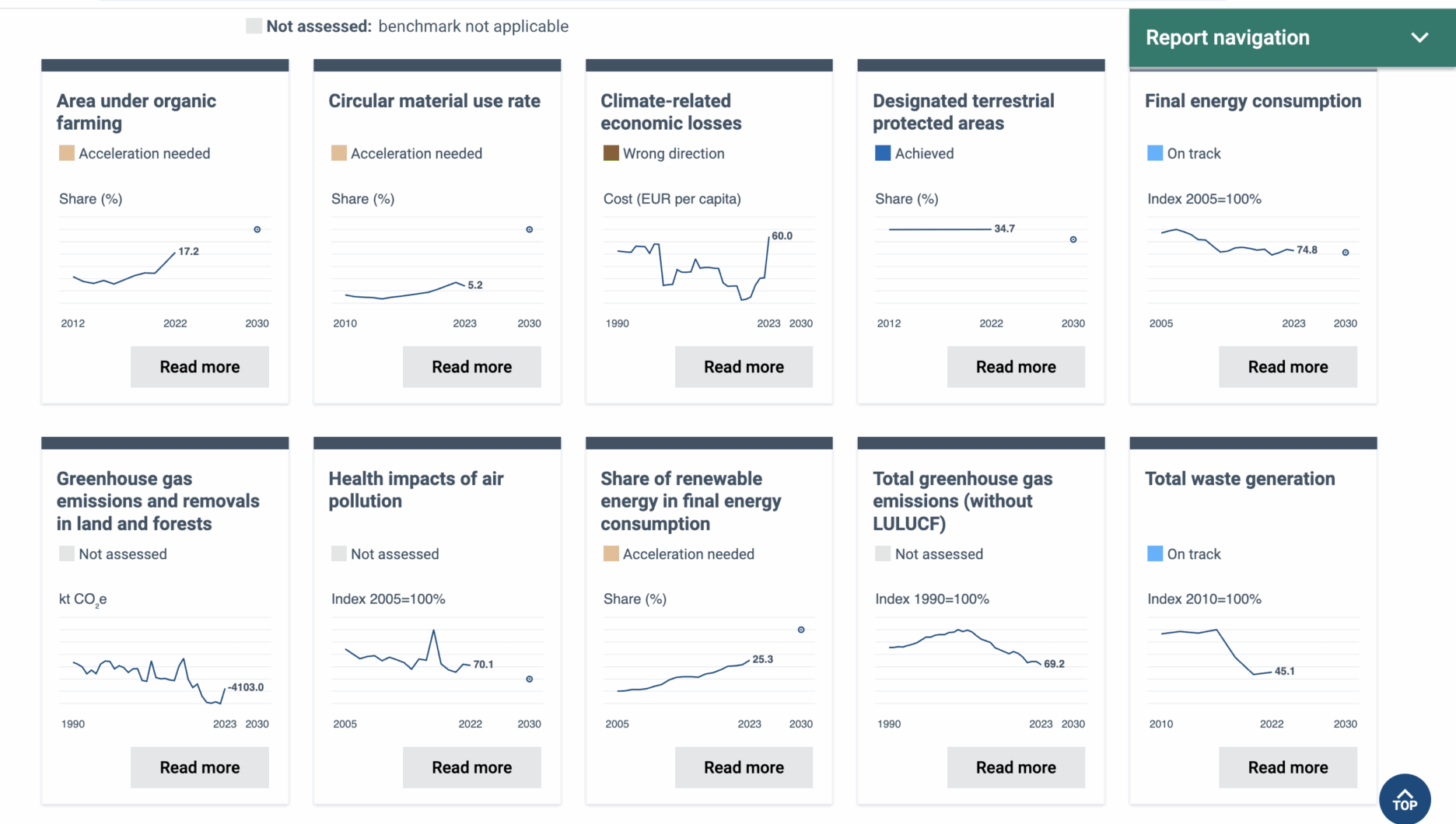 Την ίδια στιγμή, η Ελλάδα παρουσιάζει θετικά αποτελέσματα σε επιμέρους στόχους βιωσιμότητας, όπως το καθαρό νερό και αποχέτευση, η βιώσιμη ενέργεια, οι βιώσιμες πόλεις, η κλιματική δράση και η θαλάσσια ζωή. Αντιθέτως, η πρόοδος στον στόχο «Υπεύθυνη κατανάλωση και παραγωγή» παραμένει κάτω από τον μέσο όρο της ΕΕ, αν και παρουσιάζει βελτίωση. Συνολικά, η Ελλάδα έχει κάνει σημαντικά βήματα προς την πράσινη μετάβαση, ωστόσο η επιτάχυνση της δράσης σε κρίσιμους τομείς όπως η κυκλική οικονομία, οι καθαρές τεχνολογίες και η προσαρμογή στις κλιματικές πιέσεις είναι απαραίτητη για να εξασφαλιστεί ότι η μετάβαση θα είναι δίκαιη, ανθεκτική και ολοκληρωμένη.