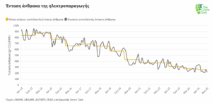 Τον Αύγουστο 2025, η ένταση άνθρακα ηλεκτροπαραγωγής μειώθηκε κατά 19% σε σχέση με τον Ιούλιο και κατά 22% σε σχέση με τον περσινό Αύγουστο φτάνοντας στα 213.9 γρ. CO2/kWh, χάρη στη μειωμένη παραγωγή από λιγνίτη και αέριο και το ρεκόρ παραγωγής από ΑΠΕ. Για τους πρώτους οκτώ μήνες του 2025, η μέση ένταση άνθρακα διαμορφώθηκε στα 255.5 γρ. CO2/kWh, 5.7% κάτω από τα επίπεδα του 2024.