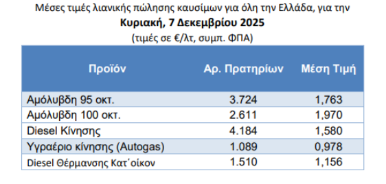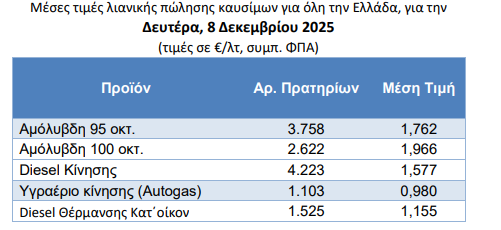 Υπενθυμίζεται πως την ίδια περίοδο τον Νοέμβριο η απλή αμόλυβδη βενζίνη βρισκόταν στο 1,748 ευρώ ανά λίτρο. Μείωση έχει σημειώσει το πετρέλαιο θέρμανσης, αφού στις 7 Νοεμβρίου βρισκόταν στο 1,168 το λίτρο.