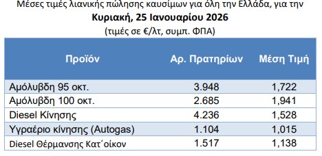 Στο 1,722 ευρώ το λίτρο βρέθηκε η μέση πανελλαδική λιανική τιμή της απλής αμόλυβδης βενζίνης την Κυριακή 25 Ιανουαρίου, με την premium αμόλυβδη να φτάνει το 1,941 ευρώ το λίτρο. Το ντίζελ κίνησης βρέθηκε στο 1,528 ευρώ το λίτρο, ενώ το πετρέλαιο θέρμανσης ανήλθε σε 1,138 ευρώ. Το υγραέριο κίνησης έφτασε το 1,015 ευρώ το λίτρο.