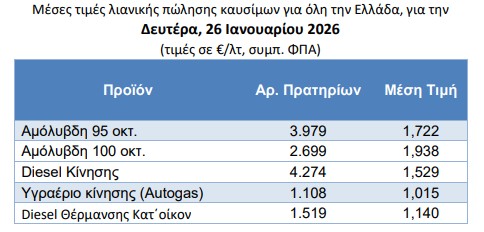 Χθες, Δευτέρα 26 Ιανουαρίου, η πανελλαδική λιανική μέση τιμή της απλής αμόλυβδης βενζίνης κόστιζε 1,722 ευρώ το λίτρο, αμετάβλητη σε σχέση με την Κυριακή, ενώ η premium αμόλυβδη έπεσε στο 1,938 λεπτά το λίτρο. Το ντίζελ κίνησης παρέμεινε ουσιαστικά αμετάβλητο στο 1,529 ευρώ ενώ το πετρέλαιο θέρμανσης έφτασε το 1,140 ευρώ το λίτρο. Το υγραέριο κίνησης κόστιζε τη Δευτέρα 1,015 ευρώ το λίτρο, δηλαδή όσο και την Κυριακή.