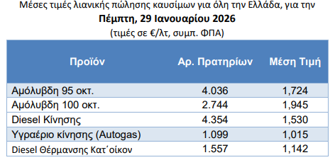 Υπενθυμίζεται πως την 1η Ιανουαρίου 2026, η τιμή της απλής αμόλυβδης πανελλαδικά βρισκόταν στο 1,717 ευρώ το λίτρο, της premium αμόλυβδης στο 1,939 ευρώ και του ντίζελ κίνησης στο 1,520 ευρώ. Το ντίζελ θέρμανσης κόστιζε 1,123 ευρώ και το υγραέριο 0,988 ευρώ το λίτρο.