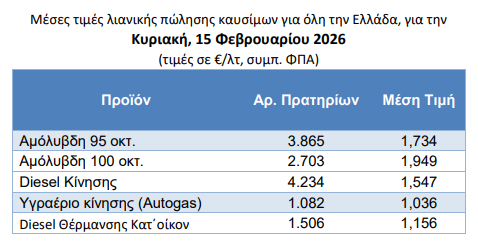 Στο 1,734 ευρώ το λίτρο βρισκόταν χθες, Κυριακή 15 Φεβρουαρίου, η πανελλαδική μέση λιανική τιμή της απλής αμόλυβδης βενζίνης. Η premium βενζίνη κόστιζε 1,949 ευρώ το λίτρο και το ντίζελ κίνησης έφτασε το 1,547 ευρώ το λίτρο. Το υγραέριο κίνησης κόστιζε 1,036 ευρώ το λίτρο και το πετρέλαιο θέρμανσης έφτασε το 1,156 ευρώ το λίτρο.