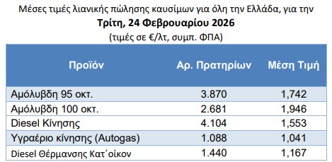 Στο 1,742 ευρώ το λίτρο βρέθηκε η μέση πανελλαδική λιανική τιμή της απλής αμόλυβδης βενζίνης την Τρίτη 24 Φεβρουαρίου με την premium αμόλυβδη να φτάνει το 1,946 και το ντίζελ κίνησης το 1,553 ευρώ το λίτρο. Το υγραέριο κίνησης έφτασε το 1,041 και το πετρέλαιο θέρμανσης το 1,167 ευρώ το λίτρο.