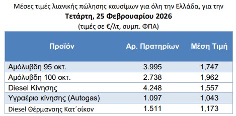 Συνεχίζεται το σερί αυξήσεων στις λιανικές τιμές καυσίμων στην Ελλάδα, με τη μέση τιμή της απλής αμόλυβδης βενζίνης να φτάνει χθες, Τετάρτη 25 Φεβρουαρίου, το 1,747 ευρώ το λίτρο από 1,742 την Τρίτη και 1,724 ευρώ την 1η Φεβρουαρίου. Η premium αμόλυβδη χθες κόστιζε 1,962 ευρώ το λίτρο, το ντίζελ κίνησης 1,557 ευρώ και το υγραέριο 1,043. Το πετρέλαιο θέρμανσης έφτασε το 1,173 από 1,145 ευρώ το λίτρο την 1η Φεβρουαρίου.