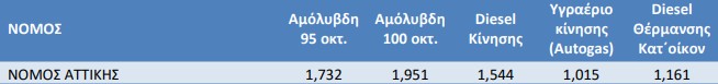 Όσον αφορά την Αττική συγκεκριμένα, την Τετάρτη η μέση τιμή της αμόλυβδης βρισκόταν στο 1,732 ευρώ το λίτρο, της premium αμόλυβδης στο 1,951 και του ντίζελ κίνησης στο 1,544. Το υγραέριο κίνησης κόστιζε 1,015 και το πετρέλαιο θέρμανσης 1,161 ευρώ το λίτρο.