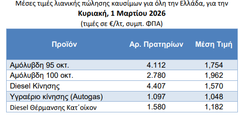 Στα 1,754 ευρώ το λίτρο έφτασε την Κυριακή 1η Μαρτίου η πανελλαδική μέση λιανική τιμή της απλής αμόλυβδης βενζίνης, με την τιμή στην Αττική να φτάνει τα 1,738 ευρώ το λίτρο. Η πανελλαδική τιμή της premium αμόλυβδης έφτασε τα 1,962 ευρώ και το ντίζελ κίνησης τα 1,570, με το υγραέριο να κοστίζει 1,048 και το πετρέλαιο θέρμανσης να φτάνει τα 1,182 ευρώ το λίτρο. Στην Αττική το πετρέλαιο θέρμανσης κόστιζε χθες γύρω στο 1,168 ευρώ το λίτρο, ενώ η premium αμόλυβδη βρισκόταν στα 1,950 και το ντίζελ στα 1,557 ευρώ. Τέλος, το πετρέλαιο θέρμανσης κόστιζε χθες στην Αττική 1,168 ευρώ το λίτρο.