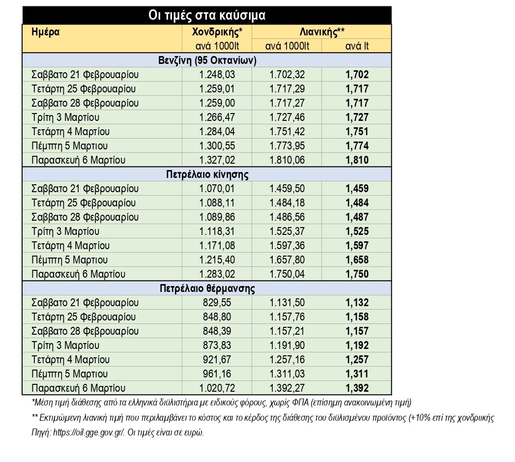 Με αυτόν τον τρόπο η τιμή της βενζίνης έχει διαμορφωθεί πάνω από τα 1,8 ευρώ το λίτρο, το diesel κίνησης ξεπερνά τα 1,75 ευρώ το λίτρο και το diesel θέρμανσης τα 1,4 ευρώ το λίτρο. Πρόκειται για επίπεδα τιμών που συναντούσαμε την περίοδο της ενεργειακής κρίσης, ιδιαίτερα όσον αφορά το πετρέλαιο θέρμανσης και κίνησης. Από τον χειμώνα του 2023 είχαμε να δούμε αντίστοιχες τιμές, δηλαδή από την περίοδο της ενεργειακής κρίσης που ξέσπασε το 2022.