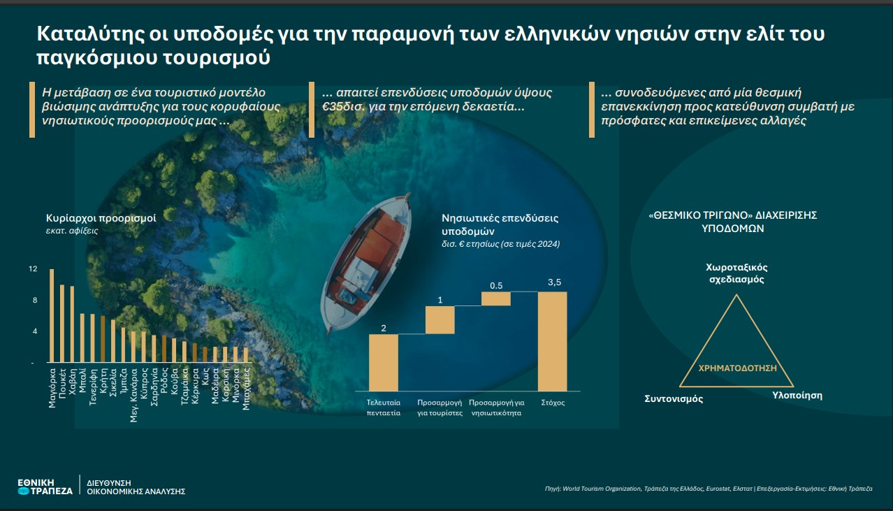 Μια νέα μελέτη της Εθνικής Τράπεζας (ΕΤΕ) υπογραμμίζει ότι τα ελληνικά νησιά θα χρειαστούν επενδύσεις ύψους 35 δισ. ευρώ έως το 2035 για να διατηρήσουν τη διεθνή τους ανταγωνιστικότητα στον τουρισμό. Οι πόροι αυτοί είναι απαραίτητοι για την ενίσχυση κρίσιμων υποδομών, όπως οι μεταφορές, η ενέργεια, η ύδρευση και η διαχείριση απορριμμάτων, καθώς οι νησιωτικές οικονομίες επιβαρύνονται από τον εποχικό πληθυσμό και τα αυξημένα λειτουργικά κόστη.