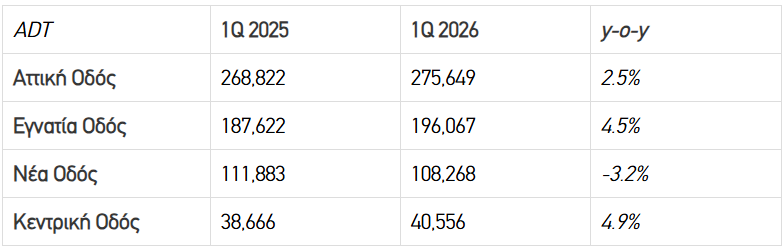 Αυξημένη ήταν η κίνηση το α’ τρίμηνο του 2026 στους περισσότερους βασικούς αυτοκινητοδρόμους που διαχειρίζεται o Όμιλος ΓΕΚ ΤΕΡΝΑ. Η Αττική Οδός κατέγραψε ετήσια αύξηση 2,5%, η Εγνατία Οδός 4,5% και η Κεντρική Οδός 4,9%, ενώ αντίθετα η Νέα Οδός κινήθηκε πτωτικά κατά 3,2%, λόγω των αγροτικών κινητοποιήσεων τον Ιανουάριο.